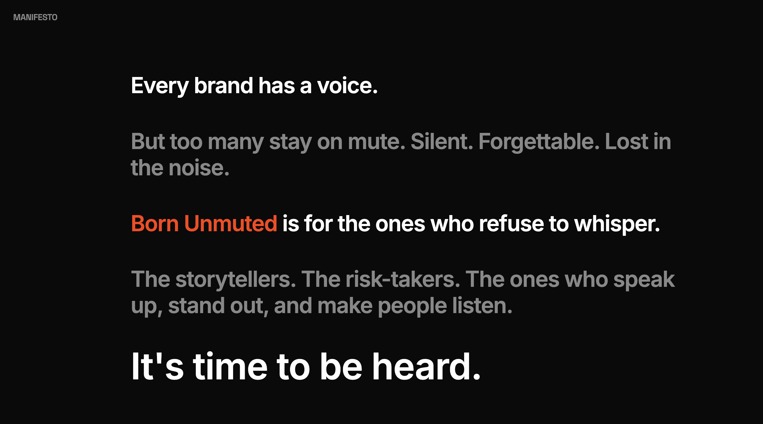 Most brands are afraid to be heard. They play it safe, blend in, and wonder why nobody's listening. We're not built for that. Born Unmuted is a creative agency for brands that are done whispering. We build strategies, campaigns, and identities that demand attention and keep it. No filler. No fluff. Just work that moves people.